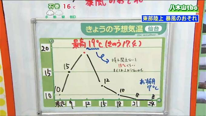 【7日宮城の天気】東部陸上で最大瞬間風速30m暴風のおそれ 昼前から西風強まり花粉大量飛散【桜情報・雨雲シミュレーション掲載】tbc気象台 東北放送 2026年4月7日(火) 11:30 国内 天気 7日の気温 予想に幅あり 今日の仙台の最高気温の予想は19℃ですが、予想以上に雲が厚く晴れ間が出ない場合は15℃程度にとどまる可能性があります。午後は風が強まるため、体感温度は気温の数字以上に低くなることが予想されます。暖かめの服装での外出をおすすめします。