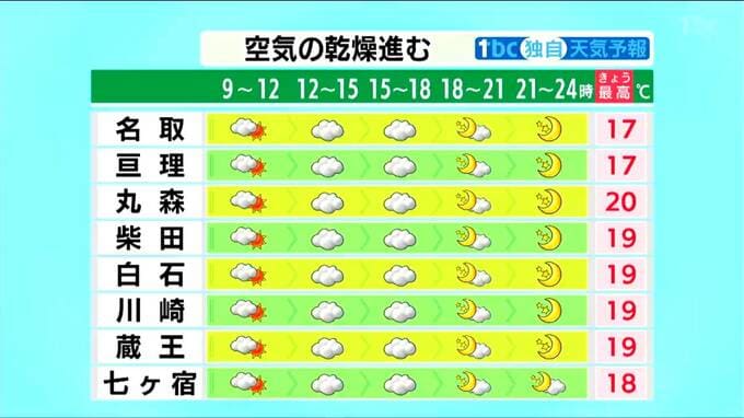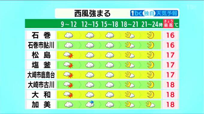 空気の乾燥が進む見込みで、名取から七ヶ宿にかけて最高気温は17〜20℃の予想です。