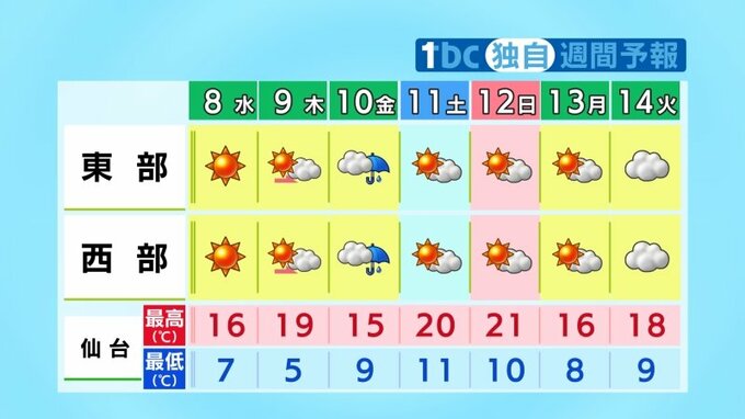 今週は晴れる日が多くなりますが、10日(金)は低気圧の影響で雨が降ったり止んだりする見込みです。気温は平年よりも高い日が続く見通しです。
