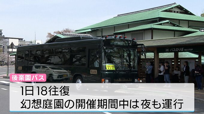 「後楽園バス」は約30分間隔で1日18往復し、幻想庭園の開催期間中は、夜も運行されます。運賃は片道120円。現在は、現金か、一部のICカードのみでの支払いとなっていますが、今年中にクレジットカード決済にも対応する予定だということです。