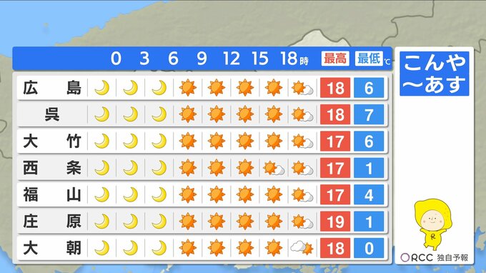 最低気温は、きょうより5℃ほど低くなり、冷え込みが強まるでしょう。北部や内陸部では0℃前後まで冷え込む予想です。農作物の管理にはご注意ください。日中の気温は20℃近くまで上がり、この時期らしい気温になるでしょう。風が穏やかで過ごしやすく、ぽかぽか陽気になりそうです。