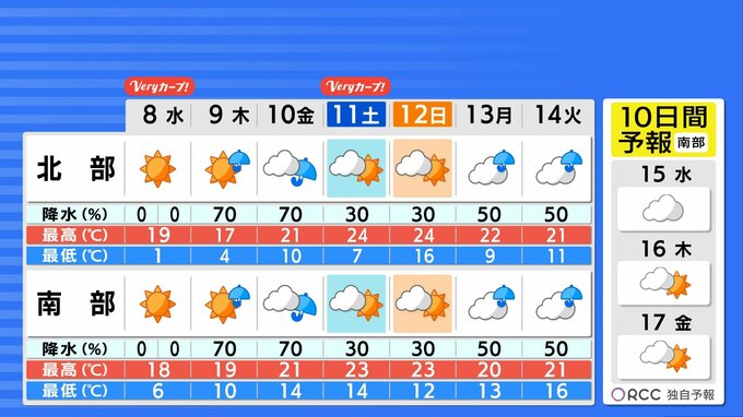 引き続き天気は周期変化し、晴天が長続きしないでしょう。木曜日・金曜日は雨が降る見込みです。雨脚が強まる時間帯があるでしょう。南部では朝晩の冷え込みも緩んできますが、北部や内陸部では晴れると朝晩と日中との寒暖差が大きくなります。体調管理にはご注意ください。週末は日差しが届き、初夏の陽気になるでしょう。