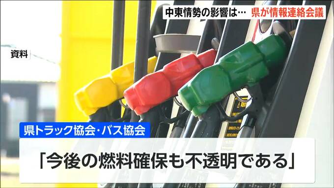 県トラック協会やバス協会からは「一部の会社で自社タンクへの燃料供給が制限され、今後の燃料確保も不透明である」との声が上がったほか、化学製品製造業からは「資材の入荷が停止していて在庫で対応しているが、次の納入が決まっていないため不安だ」といった声が聞かれたということです。