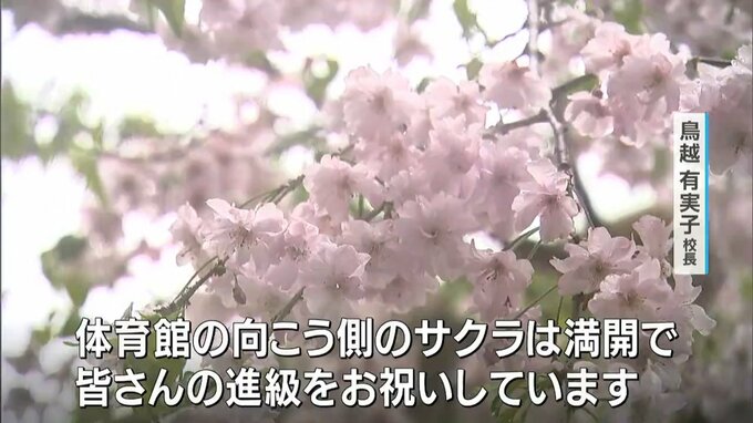 「体育館の向こう側のサクラは満開で、みなさんの進級をお祝いしてくれています。
