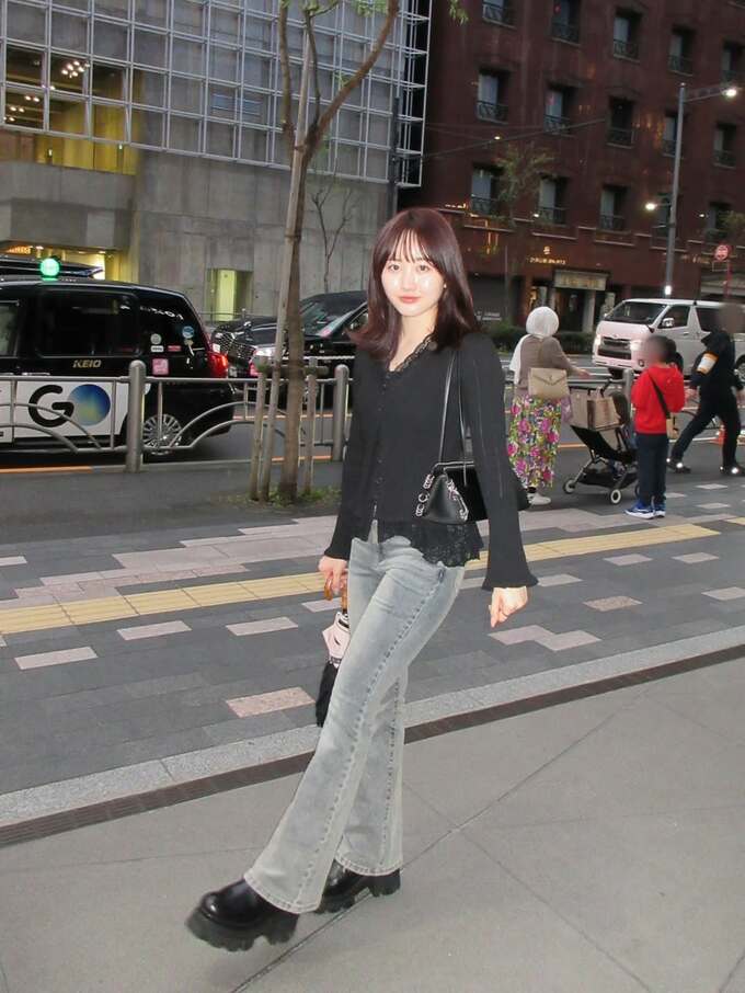 この日の本田さんは、黒のトップスに黒のカーディガンを重ね、デニムのパンツというカジュアルなコーディネイト。