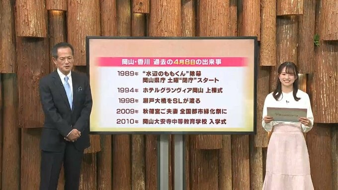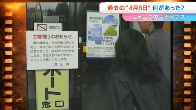 続いては同じ日、1989年の4月8日のニュース。この日から岡山県庁などで第2・第4土曜日が土曜閉庁となりました。それ以前は土曜日も県庁は業務にあたっていたんですね。