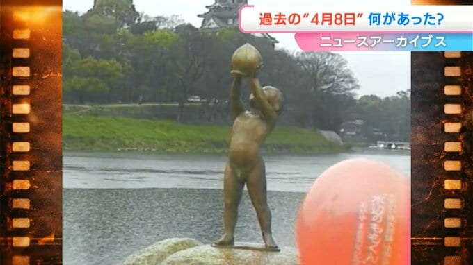 この日、お目見えしたのは「水辺のももくん」。岡山市の市制100年を記念したもので、後楽園外苑の旭川の水辺に設置された桃太郎像です。