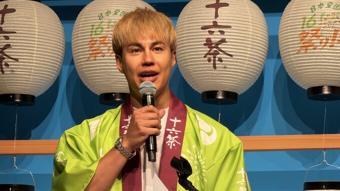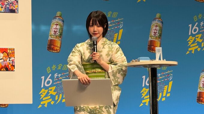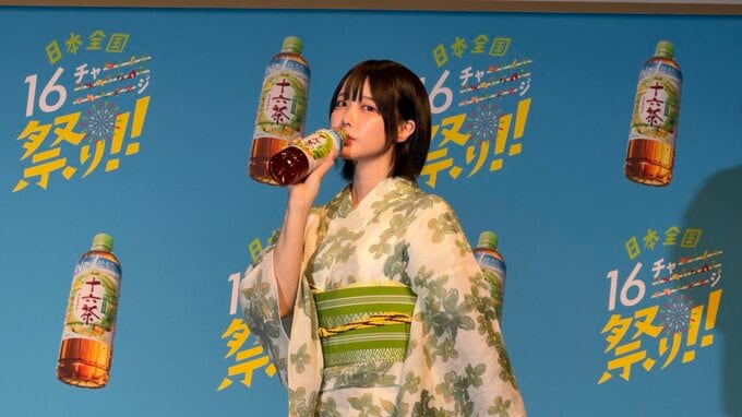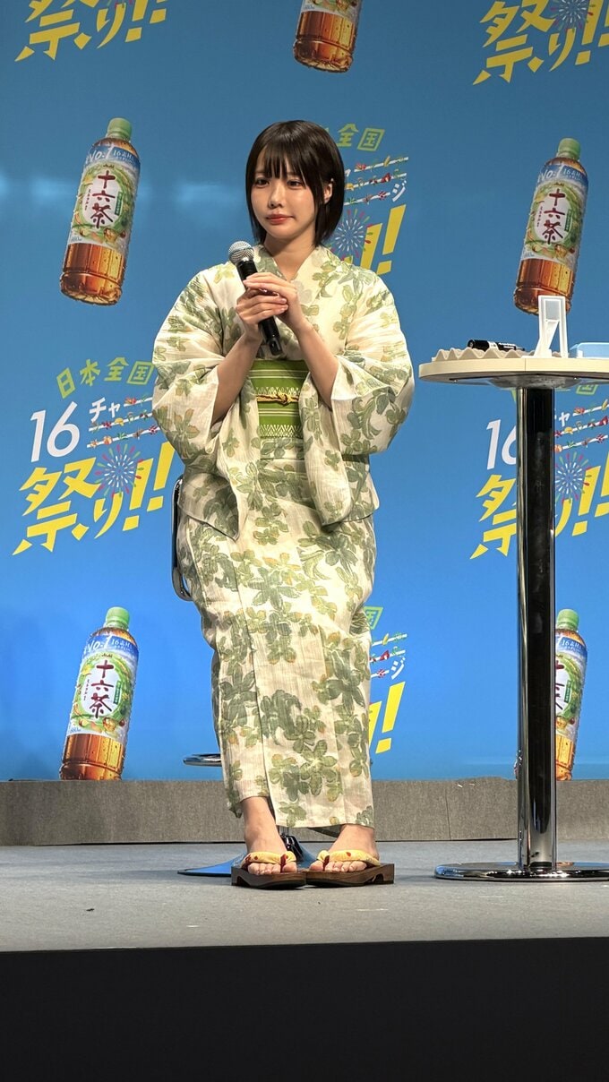 あのさんは、爽やかなグリーン調の「十六茶」をイメージした浴衣姿で登場。