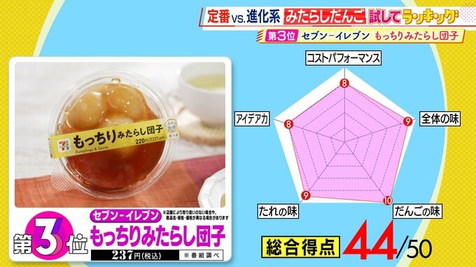 第3位は、セブン-イレブンの『もっちりみたらし団子』(税込237円 ※番組調べ ※店舗により取り扱いのない場合や、商品名・規格・価格が異なる場合があります)。