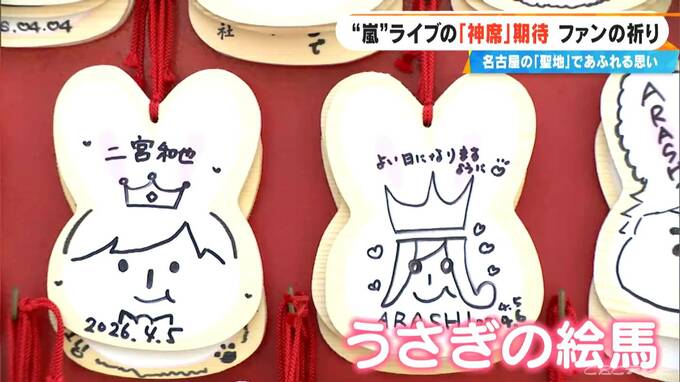 境内にかかるうさぎをモチーフにした絵馬には、嵐のメンバーのイラストやメッセージ、そして「良席祈願」の文字が目立ちます。ここは“推し活神社”として全国の嵐ファンの間でも有名なのです。