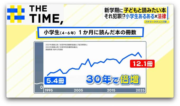 イマドキの小学校には“読書の時間”が設けられていて、小学生(4-6年)の1か月の読書量は「平均5.4冊」(1995年)⇒「12.1冊」(2025年)と30年で倍以上に。