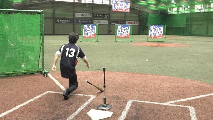 イベントでは大ヒットを祈願して、ティーバッティングを行いました。初球はポテポテのゴロで笑いを取った真田さんですが、その後は力強いヒッティングで狙った「ヒット幕」を跳び越すほどの強振を連発で披露。最後はヒット幕にも見事ヒットさせていました。
