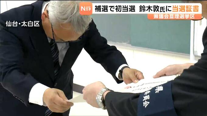 飲酒運転で摘発された議員の辞職に伴う宮城県議会亘理選挙区の補欠選挙で、無投票で初当選した鈴木敦氏に当選証書が付与されました。仙台市内で行われた付与式では、鈴木敦氏に当選証書が手渡されました。鈴木氏は…