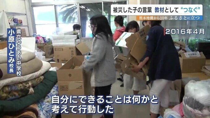 熊本県立ゆうあい中学校 小原ひとみ校長「熊本地震が発生した時に、子ども達が避難所とかで、自分にできることは何かと考えて行動した。その思いやりの心や感謝の心とか、これをどうにかして、熊本地震の経験を語り継ぐ方法はないのかなというのを考えて」