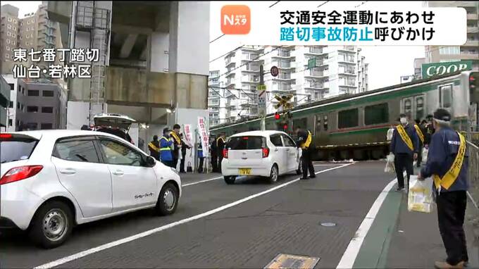 仙台市若林区の東七番丁踏切では、JR東日本の社員や警察など約20人が通行人にチラシを配りました。警報音が鳴り始めたら踏切内に進入しないことや万が一の場合は、速やかに非常ボタンを押すことなどを呼びかけました。