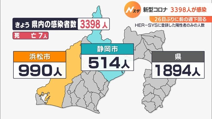 12月31日、静岡県内では、新たに3398人が新型コロナウイルスに感染したことがわかりました。新たな感染者は浜松市が990人、静岡市が514人、その他の市や町の合計が1894人です。県内で7人の死亡が報告されています。…