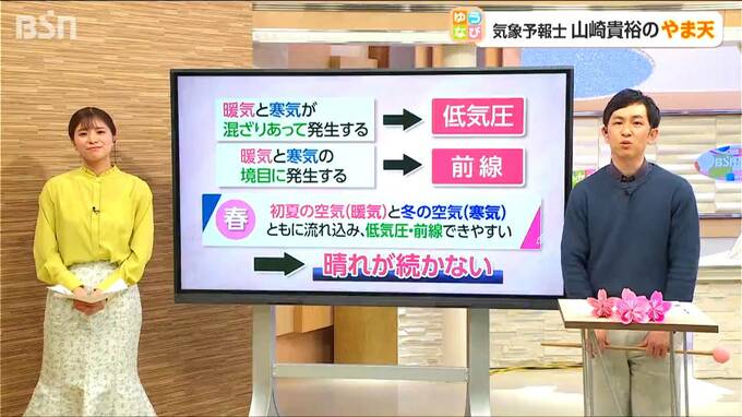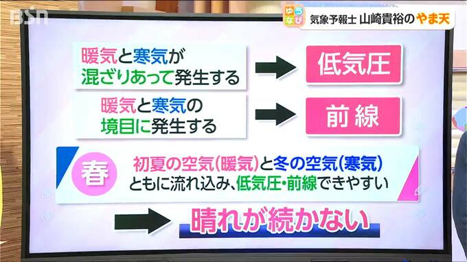 今の時期は、この暖気と寒気がどちらも流れ込みやすいため、低気圧や前線が次々と作られます。 だから、春の晴天は三日と持たず、コロコロとお天気が変わってしまうんですね。