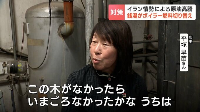 「この木がなかったらいまごろなかったかな、うちは。無理だったかな、重油だけだったら。重油だけだったらお休みしていた方がいいかもしれない。お店開けないでお休みしてます。どうにか原油が安定して皆さん平和に過ごせるように戦争が終わるのが一番」
