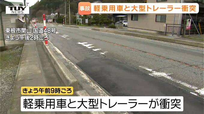 消防などによりますときょう午前9時ごろ、東根市関山の国道48号で軽乗用車と大型トレーラーが衝突したということです。