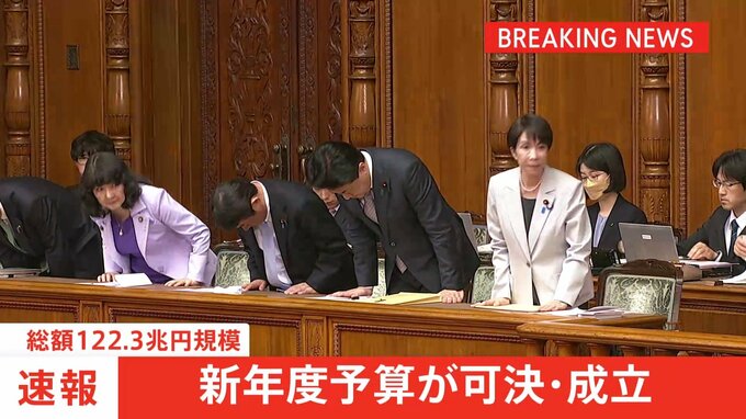 新年度予算が先ほど、参議院本会議で与党などの賛成多数で可決され、成立しました。新年度予算は一般会計の総額が過去最大となる122兆3092億円で、社会保障費に39.1兆円、国債費に31.3兆円を計上しています。きょ…