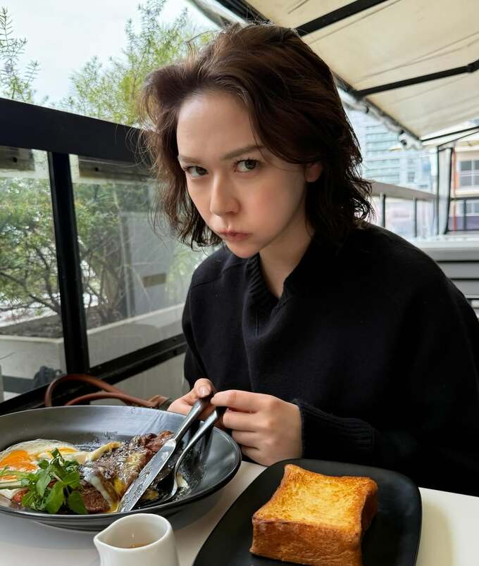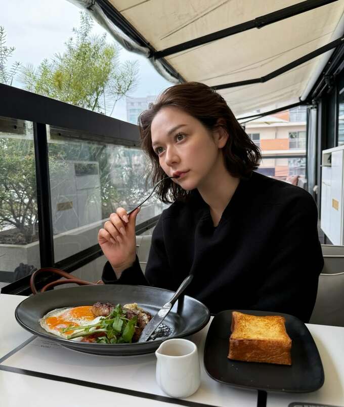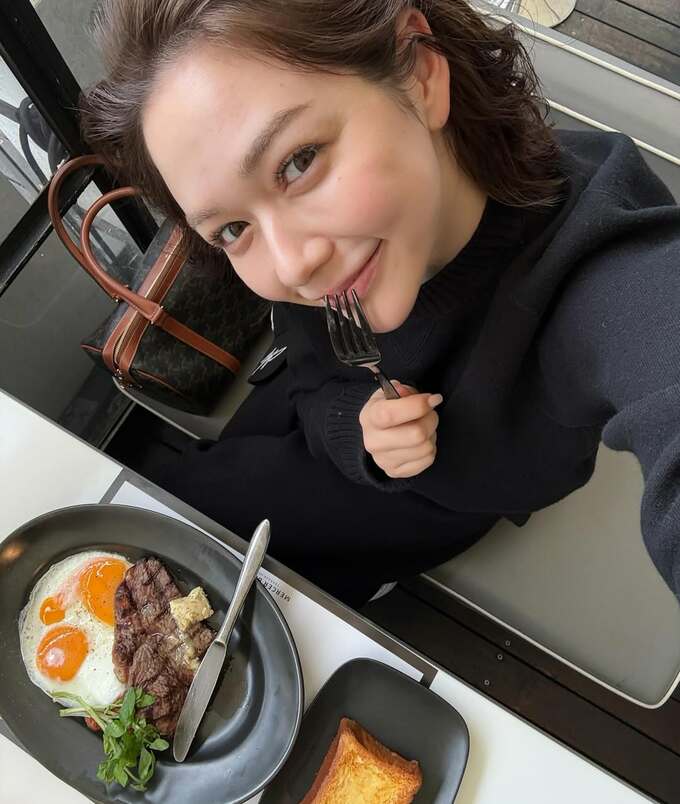 都内の人気カフェと思われる場所で、大きな目玉焼きとクレソンが添えられたビーフステーキとフレンチトーストを前に、嬉しそうな笑顔を見せています。
