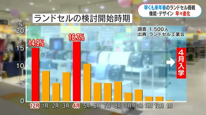 年々早まる購入時期です。日本かばん協会ランドセル工業会の調査によりますと、ランドセルの購入を検討する時期は、入学1年前の4月が最も多く、さらに前倒しして12月と答える人もいます。