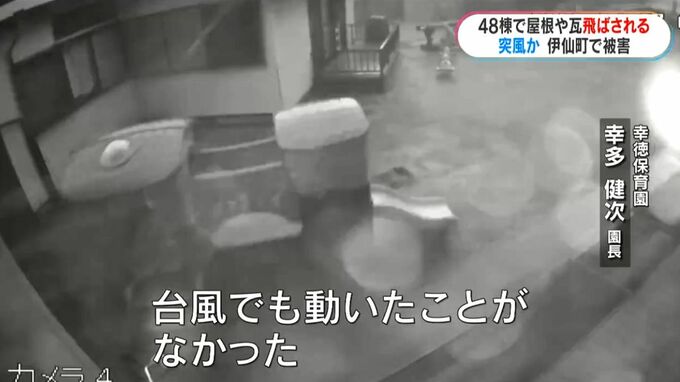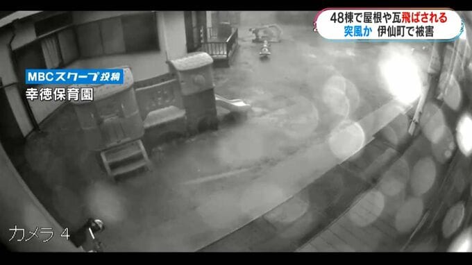 こちらは午前6時半ごろ、伊仙町にある保育園の監視カメラの映像です。ゴミ箱や網戸などが飛ばされ、滑り台も風にあおられています。