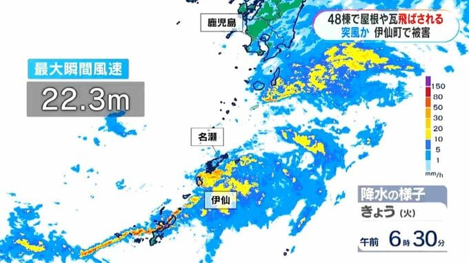 春の嵐で被害が広がっています。鹿児島県の徳之島・伊仙町で7日朝、住宅など48棟で屋根や瓦が飛ばされる被害がありました。気象庁は突風による被害とみて、現地調査することにしています。