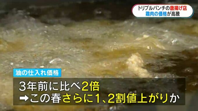 さらに、調理に欠かせない油の仕入れ価格は、店がオープンした3年前に比べ2倍に値上がり。この春の値上げで今よりもさらに1、2割値上がりする見通しです。