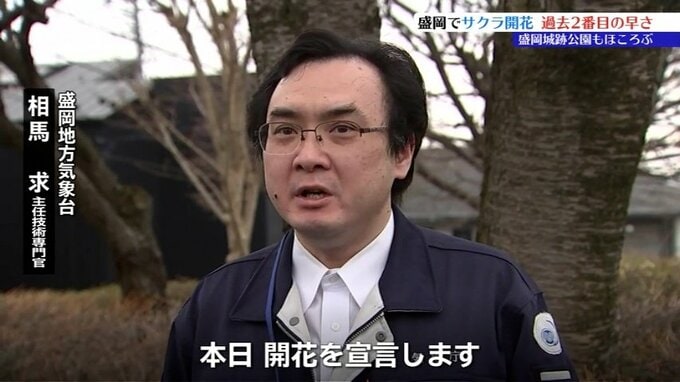 7日午前9時半ごろ、盛岡地方気象台の職員が敷地内にあるソメイヨシノの標本木に5、6輪、花が咲いているのを確認し開花を発表しました。