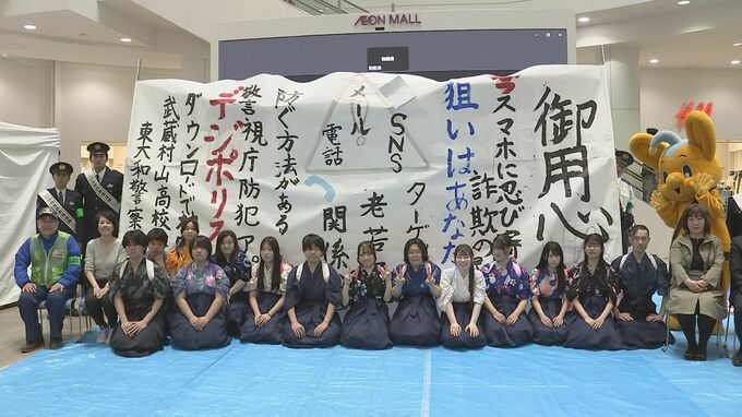 また、イベントでは都立武蔵村山高校書道部によるパフォーマンスも行われ、「御用心 スマホに忍び寄る詐欺の影 狙いはあなた」などと書き上げました。