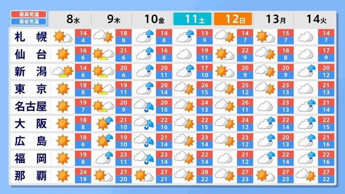 10日(金)から11日(土)ごろにかけても発達する低気圧の影響などを受ける見込みで、北日本から西日本の広い範囲で荒れた天気となりそうです。