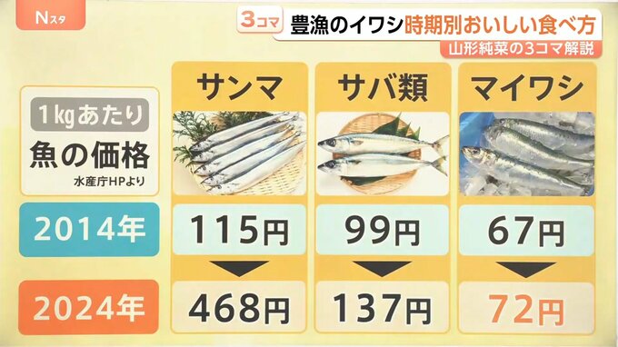 サンマは約4倍、サバ類は約1.4倍の価格となっていますが、マイワシは約1.1倍と比較的価格が安定しています。