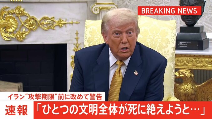 アメリカのトランプ大統領は自らが設定したイランの発電所などへの攻撃の期限が迫るなか、「ひとつの文明全体が死に絶えようとしている」とSNSに投稿しました。トランプ大統領は7日、「ひとつの文明全体が死に絶え…