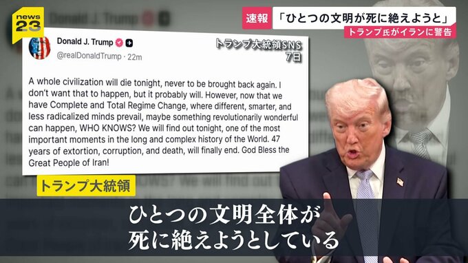 トランプ大統領が通告しているイランとの交渉期限がおよそ10時間後に迫っています。こうした中トランプ大統領は「ひとつの文明全体が死に絶えようとしている」とイランを改めて強く警告しました。