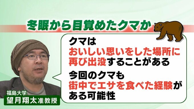 野生動物の生態に詳しい福島大学の望月翔太准教授は、冬眠から目覚めたクマの可能性が高いとみていて、「クマはおいしい思いをした場所に再び出没することがあり、今回のクマも、去年、街中に出てエサを食べた経験がある可能性がある」ということです。