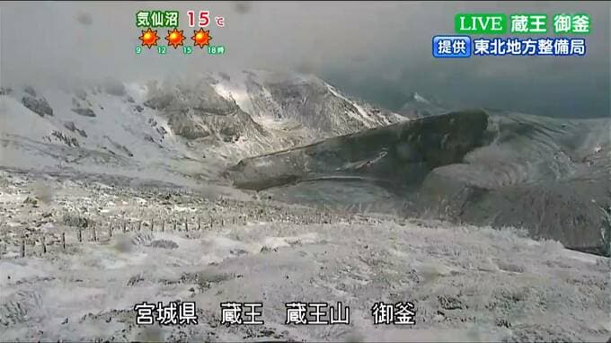 また、蔵王の御釜周辺も最近は暖かさで雪解けが進んでいましたが、雪雲の影響で御覧のように新雪が積もっています。
