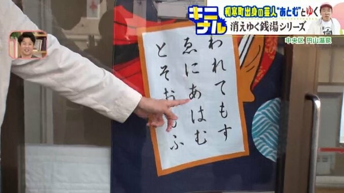 のれんがいいわ。「われてもすゑにあはむとそおもふ」意味は…もう風呂入れっちゅうことだから。(※正しくは『小倉百人一首』の和歌で「またこの銭湯で会いましょう」というような意味)