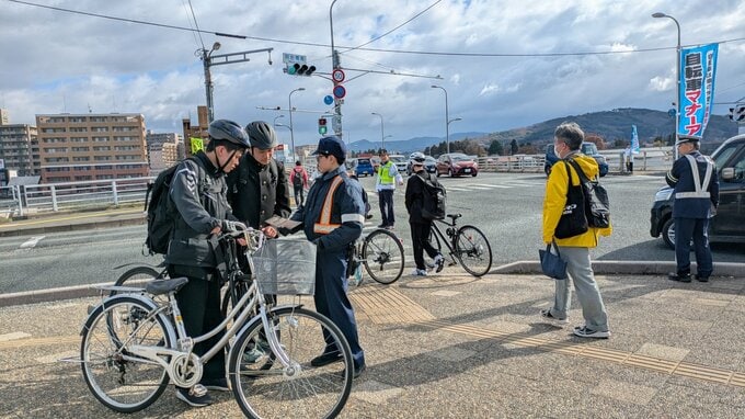 これは毎月8日の「岩手県自転車安全指導の日」にあわせて行われたもので、8日は午前7時半ごろから盛岡市の明治橋南袂で、警察官などおよそ15人がチラシを配るなどして「青切符」制度の周知を図りました。