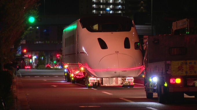 2016年の熊本地震で被災した九州新幹線「つばめ」の車両が、8日未明、博多港から陸路で博多駅前に運ばれました。