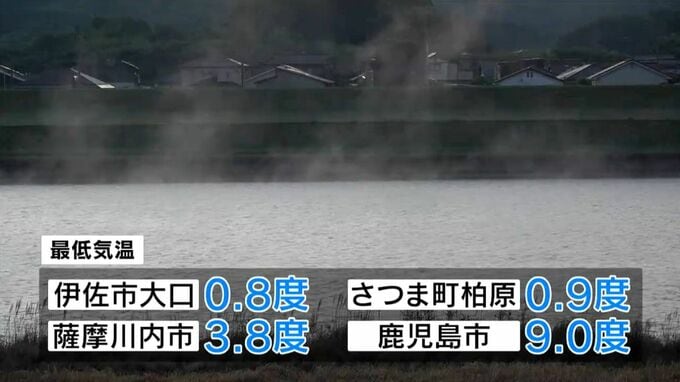各地の最低気温は、伊佐市大口で0.8度、さつま町柏原で0.9度、薩摩川内市で3.8度、鹿児島市で9.0度など2月中旬から下旬並みの気温となりました。