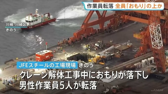 この事故はきのう川崎市川崎区のJFEスチールの工場で、クレーンの解体工事を行っていた際にクレーンのおもりが落下し男性作業員5人が転落したものです。