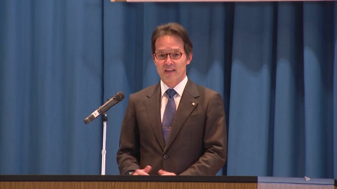 始業式で鈴木大聖校長は「あいさつ、チャレンジ、思いやり」の3つを大切にするよう呼びかけました。