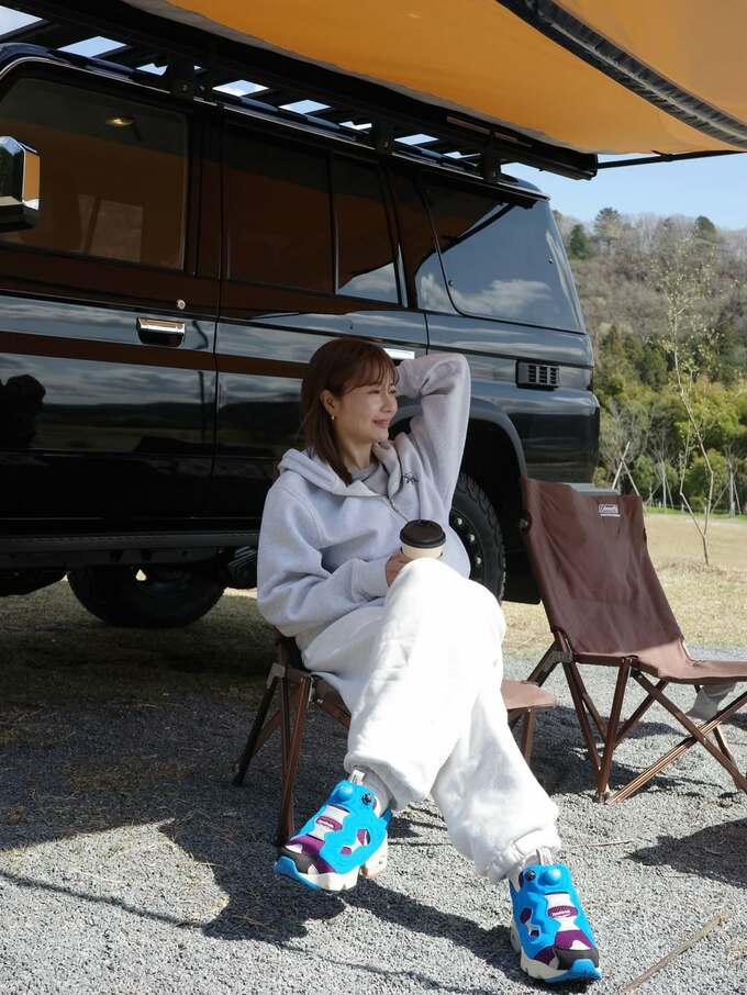 また、ランクル70にオプションで装備したサイドオーニングで日よけを設置し、白のパーカー姿で折りたたみチェアに腰掛けながらくつろぐショットも披露。夜にはたき火を楽しむ様子も投稿しています。