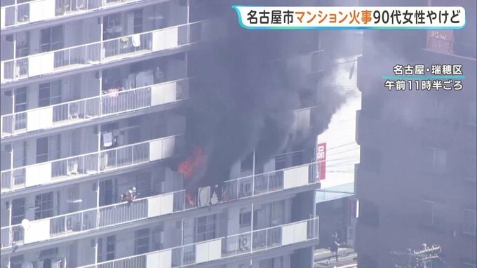 名古屋市瑞穂区のマンションで火事があり、90代の女性がやけどをして病院に運ばれました。報告「名古屋市瑞穂区の火災現場上空です。集合住宅の一室から激しく黒煙と炎があがっています」きょう午前11時ごろ、名古…