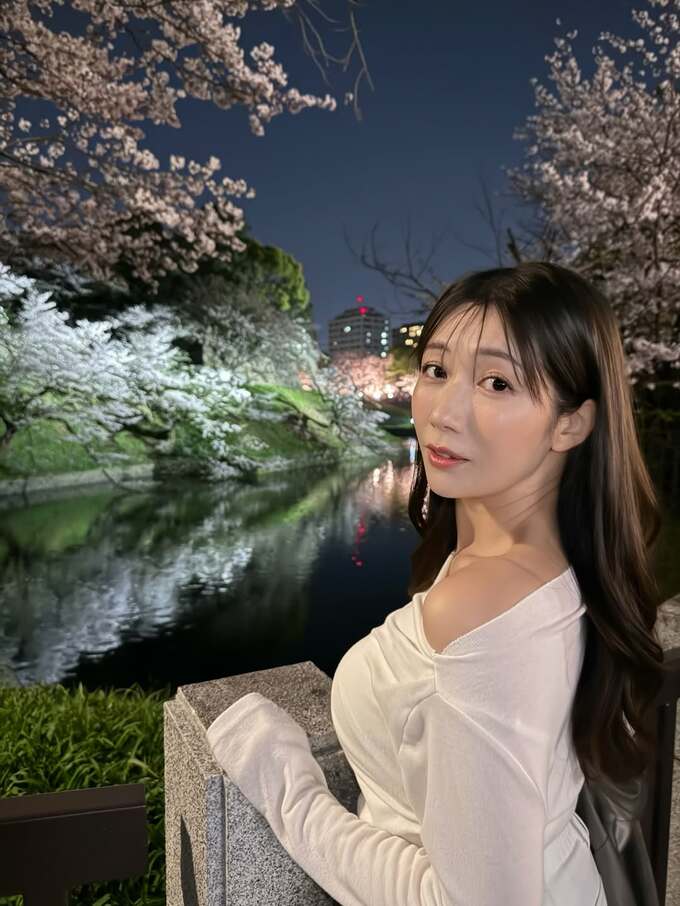穂川さんは春らしい白のギャザーの入ったドレープのトップスを着用。皇居のお堀の水面には桜の花が映り込み幻想的な景色が広がっています。