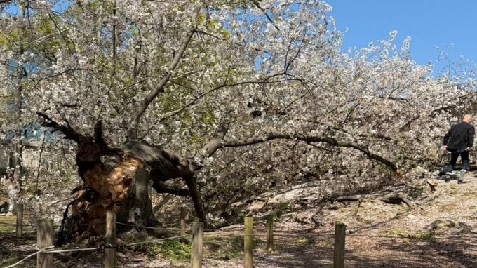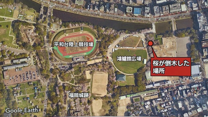 8日午後2時前、花見の名所として知られる福岡市中央区の舞鶴公園(福岡城跡)で桜の木が根元から倒れました。