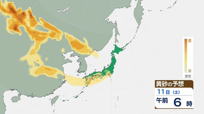 黄砂の飛来予想シミュレーションでは、中国大陸から黄砂が流れてきて、9日には北海道に、10日頃からは中国・四国・九州地方、その後西日本・東日本の広い範囲に飛散が広がっていく予想となっています。