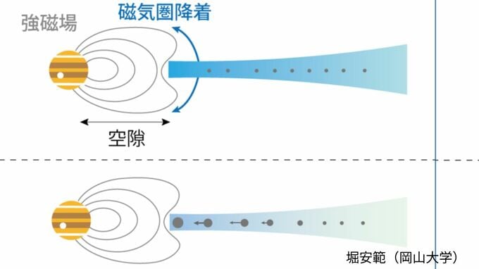 研究では、内部では数倍の差に留まる磁場が、惑星表面では木星が土星より約100倍強いと算出されました。磁場が強い場合、ガスが惑星磁場に沿って流れ込む「磁気圏降着」が生じます。