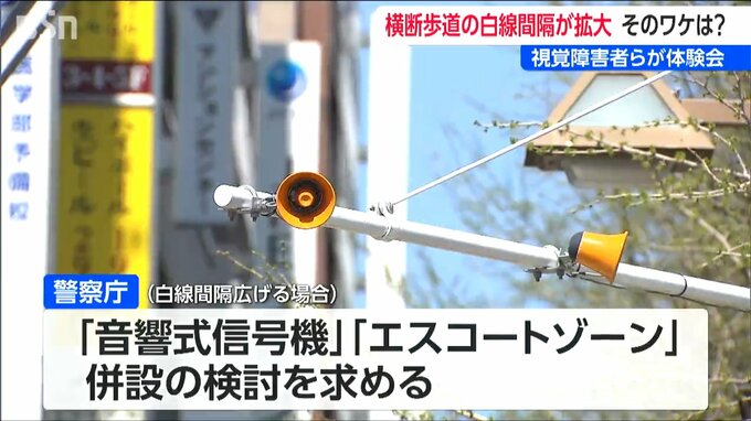 今回のように白線間隔を広げる場合、警察庁は「音響式信号機」と点字ブロックのような「エスコートゾーン」の併設を検討するよう求めています。